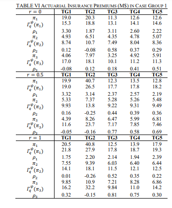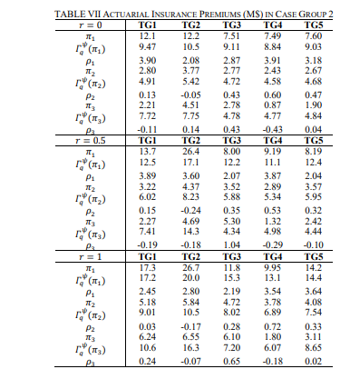 To gauge the relative premium burden against the expected risk, RLC is defined as follows: π(βπ) = π(βπ)/πΈ[βπ]β 1 (12) where π(βπ) should be generally positive to gather sufficiency budget for loss coverage. While positive RLC is preferable against the unexpected extreme risk, excessively high RLC would discourage the TGs from insurance participation. In [17], the indemnities of π1(βπ) are not clearly specified since the original design is tailored to a third-party insurer. In this paper, all premium designs are assumed to be mutual insurance. All participating entities are both insurers and insureds. For the sake of brevity, the indemnities of π1(βπ) are proportionally allocated based on π€π π (π2): π€π π (π1 ) = βπ π1(βπ) β π€π π(π2) β π€π π π (π2) (13) In Tables VI and VII, π1 , π2 , and π3 are evaluated based on the loss statistics extracted from the two case groups with heavy tail risks. Characteristics of each design will be further elaborated numerically as follows. The premiums of Case Group 1 are shown in Table VI. In each TG, π1 , π2 , and π3 are positively correlated with the strength of correlation π. π1 has the most conservative payment schedule and can be financially burdensome. π1 may penalize the participants with heavy risk loading when extreme catastrophic events do not happen. Cost-effectiveness of π1 is unacceptably low because the maximum of π1 exceeds 3. On the flip side, π2 is an entry-level premium design devised to be the most affordable and evenly distributed package across the TGs. π2 offers small indemnities and the premiums collected from the TGs.
