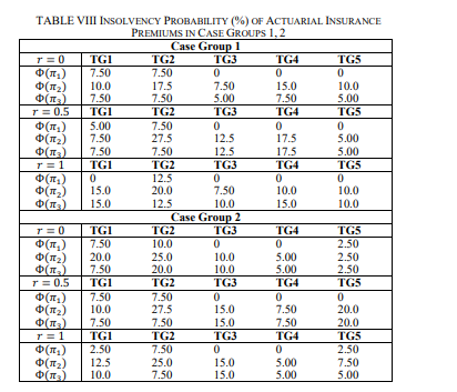 In Table VII, risk loading in Case Group 2 generally increase due to the enhanced security measure that reduces tail risk profile. π1 has a maximum close to 4 and could be too high to motivate entities to participate in. π2 is evenly distributed against average risk, with π2 lying in [-0.24 0.72]. π3 renders ideal risk loading π3 to rarely exceed 1. High capacity of indemnity and low risk loading make the proposed π3 a potentially compelling insurance model in practice. The probability of insolvency Ξ¦(π) is another risk measure which quantifies the capability of the insurance to mitigate the insolvency. Ξ¦(π) is defined as the probability that the loss is greater than the indemnity: Ξ¦(π) = Pr[βπ > π€π π (π)] (14) As shown in Table VIII, in Case Group 1, π1 generally provides the best insolvency alleviation with lowest probabilities of insolvency. In fact, π1 is such a conversative premium design against risk that the insolvency in some cases is 0. While π3 leads to the insolvency being lower than π2 and greater than π1 , π3 has the affordability superior to π1 .