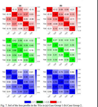 Since a stronger correlation π signifies the infectiousness of the epidemic model and tends to bring higher expected losses, the common cyber risk across TGs also increases. In Case Group 2, the incentive of investing on cyber-physical enhancement can be observed from Table V that expected losses are reduced substantially and reduction of SDs occurs to a lesser extent, with CoVs lying in [0.88 1.33]. In Fig. 7, the sampled SoI among the TGs are demonstrated in the Pearson correlation matrix.