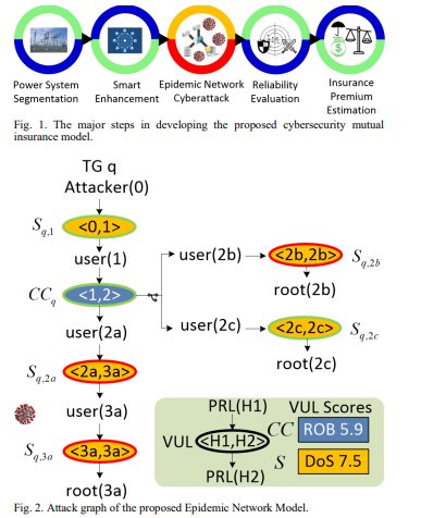 Each node represents a vulnerability. In the proposed ENM, two types of anomalies, ROB and DoS, are considered. ROB attack decrypts the control centerโs server privilege by iterating queries to a control server. DoS attack on the substation server is triggered by unauthenticated clients issuing specially crafted messages. The successful exploitation condition of vulnerability ๐ฃโ occurs Fig. 1. The major steps in developing the proposed cybersecurity mutual insurance model. Fig. 2. Attack graph of the proposed Epidemic Network Model. when the server privilege is obtained by the attacker, denoted as ๐โ. Vulnerability scores are determined by CVSS comprising the base score, temporal score, and environmental score that take a wide range of attack-related factors into account, including confidentiality, integrity, availability, attack complexity, privileges required, and exploit code maturity [24].