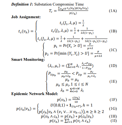 The substation infection time ๐๐๐๐ and recovery time ๐๐๐๐ are estimated by the maximum and expected values of the respective vectors. The probability of cyberattack infection ๐๐๐ก๐ is calculated using ๐๐๐๐ and ๐๐๐๐. Then ๐๐๐ก๐ is compared with a uniform variate to determine whether the substation server is compromised by the cyberattack. The proposed Epidemic Network Model concerns a software-based cyberattack whose impacts would be reflected in the physical power system. When the substations become infected, their operations are compromised. Specifically, the physical loss due to the cyberattack is measured by load curtailment in the reliability analysis. The economic implication of the load loss on TGs is then evaluated in the insurance premium design.