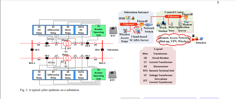 Fig. 3 depicts a typical process of epidemic propagation on a substation. The malicious attacker infiltrates the firewall of the control center through remote access network connected via a modem. If the Ethernet in the control center is breached, the attacker can gain access to the data storage, application server and operation of the workstation. Since WAP controls the substation operation via RTUs, the attacker may directly compromise the substation through the WAP without going through control center. Through infecting the network switch with malware, the attacker may further compromise the substation Intranet. That is, the attacker obtains the privilege of the SCADA server, Human-Machine Interface and the WAP. If the WAP is hacked, false commands can be sent to RTUs to modify the trip settings in different relays. The breaker operating units connected to RTUs coordinate the relays to provide overcurrent protection, overvoltage protection and differential protection. By intentionally reducing the threshold value of the overcurrent relay, the circuit breakers can be falsely tripped when no physical fault condition is presented. A detailed survey further analyzed the impacts of various cyberattack scenarios in the power systems [28]. In the following subsection, the cyber-physical enhancement strategies on the substations will be presented.